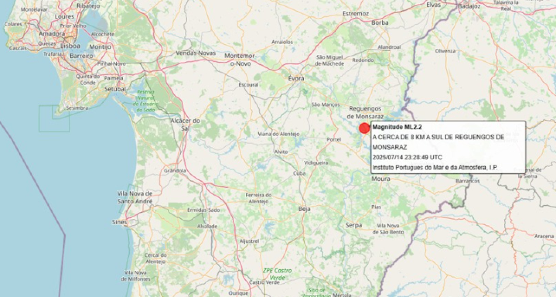 O Instituto Português do Mar e da Atmosfera registou, hoje, pelas 00:28 (hora local) nas estações da Rede Sísmica do Continente, um sismo de magnitude 2.2 (Richter) e cujo epicentro se localizou a cerca de 8 km a Sul de Reguengos de Monsaráz.