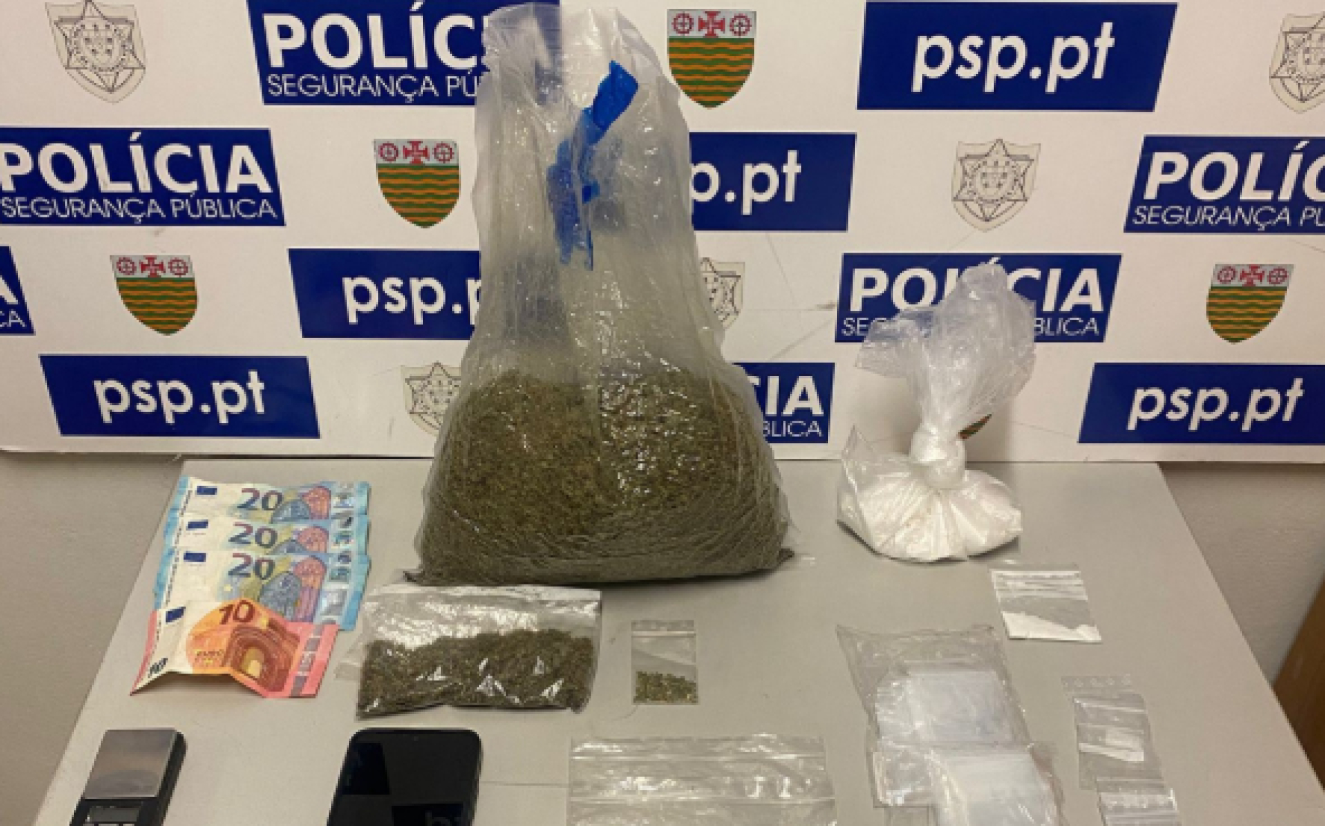 Após realização de busca sumária foi possível apreender 1 saco contendo produto psicoativo indeterminado, suficiente para confeção de 2750 doses individuais e ainda 11 doses de Cocaína. Foi feita também a recolha de outros objetos relacionados com a prática deste crime, nomeadamente 152 recortes de sacos de plástico, utilizados normalmente para divisão das doses e uma balança de precisão, para determinar o seu peso individual.